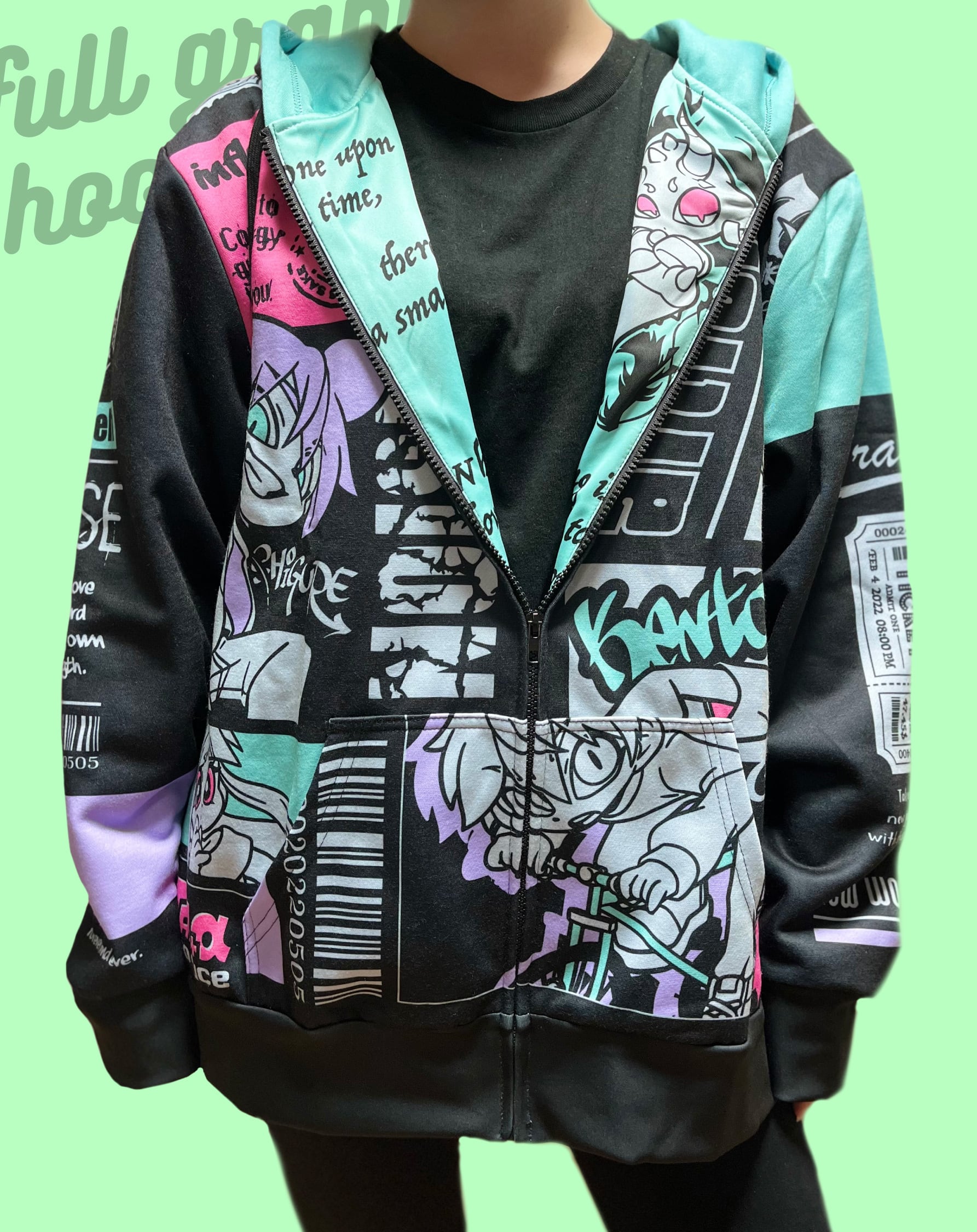 発色も良く、裏と表でデザインが違い、フードの裏、袖部分にもプリントがあります。zip部分をめくるとヒュウロンがこっそりと隠れて…!?