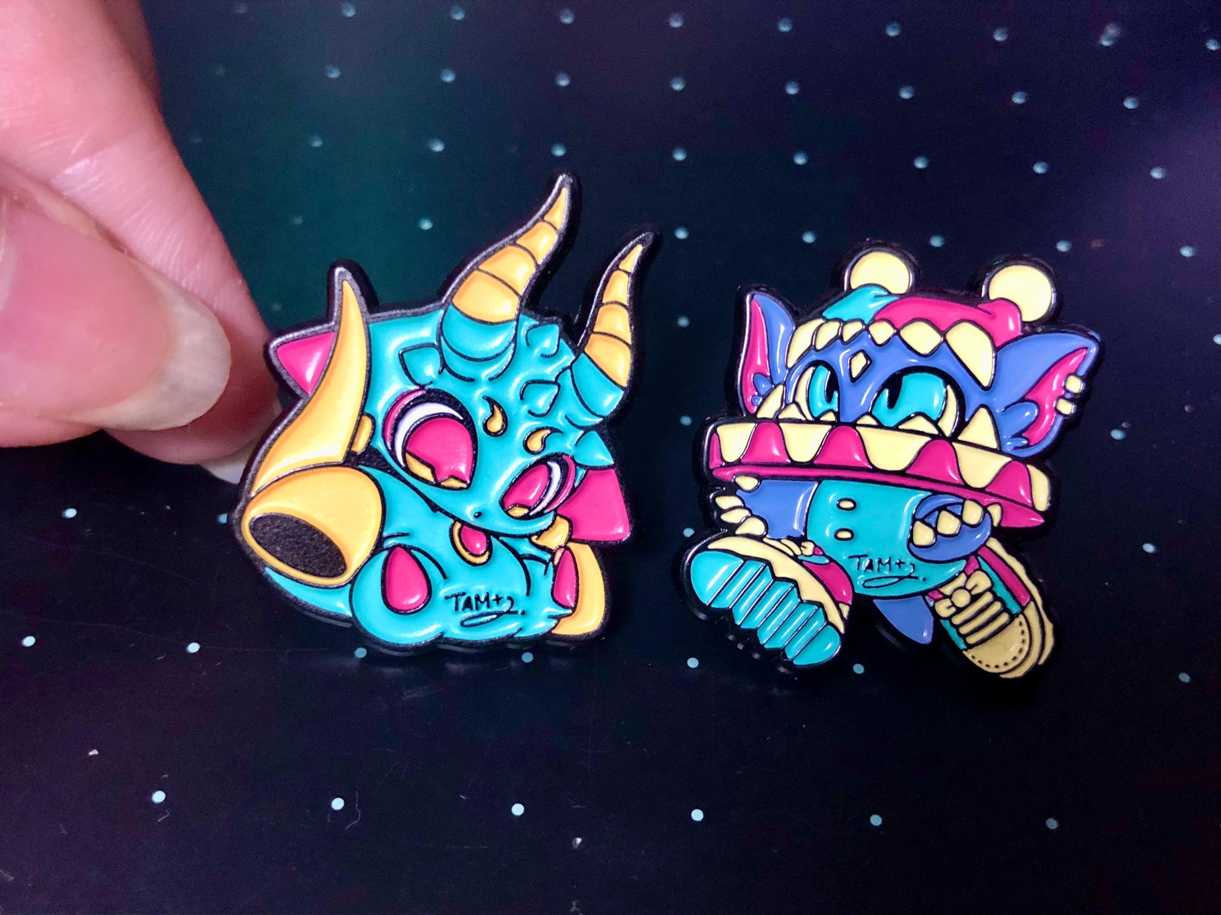 ヒュウロン(左)とコブ(右)のエナメルピンです。